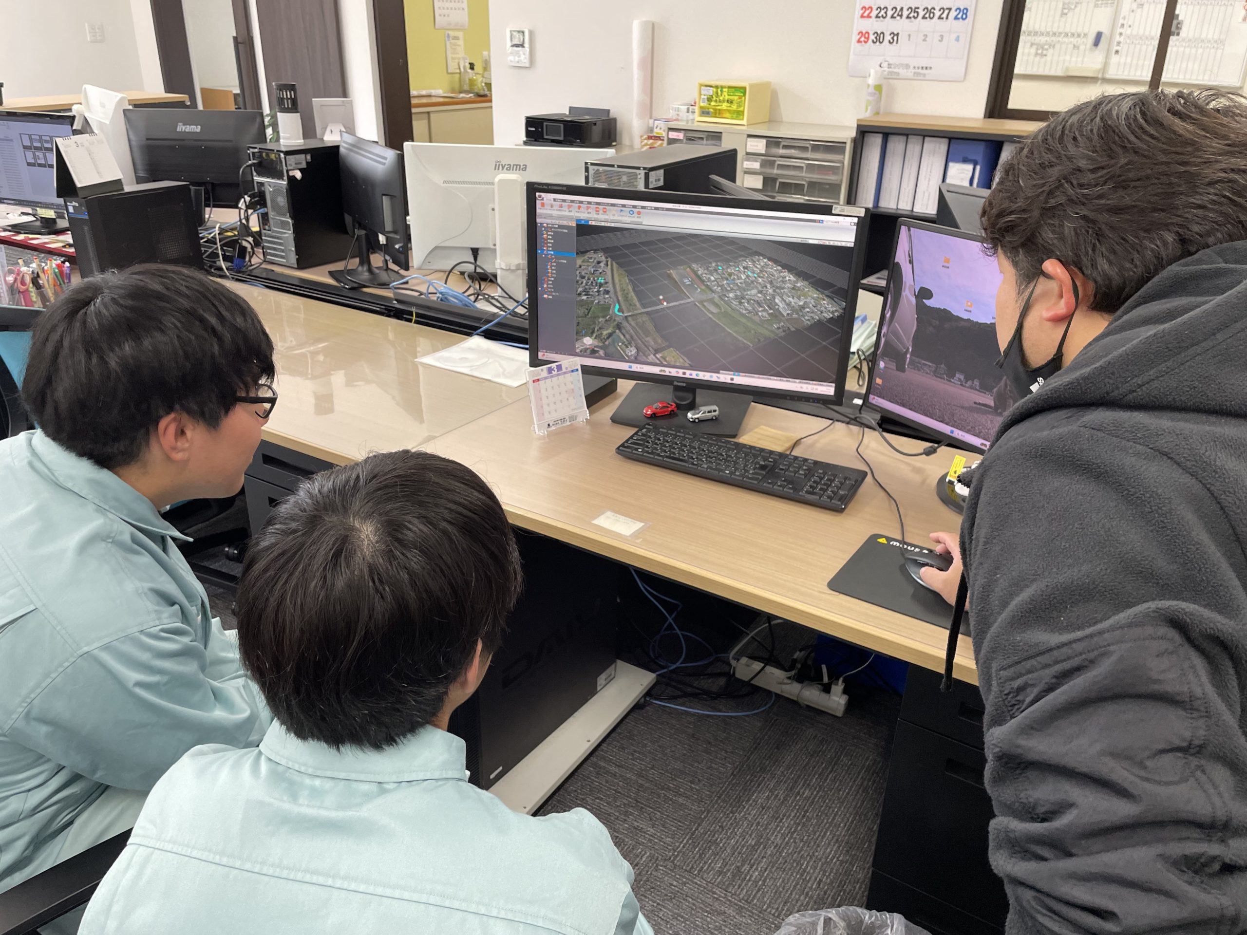 さらに、測量課では図面の見方やドローンで撮影した3次元データの説明を行い、実際にドローンの飛行の様子を見学していただきました。